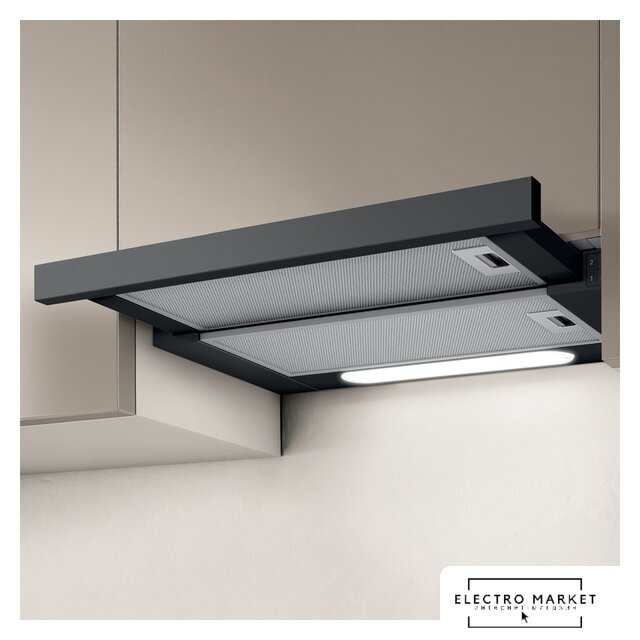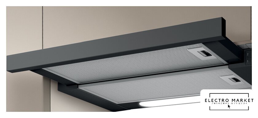 конструкция наклонная, монтаж настенный, ширина 59.5 см, управление сенсорное, производительность вытяжки 408 м³/ч, цвет черный