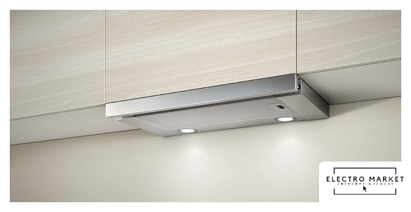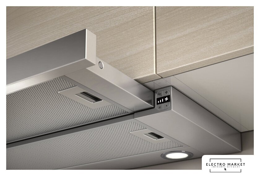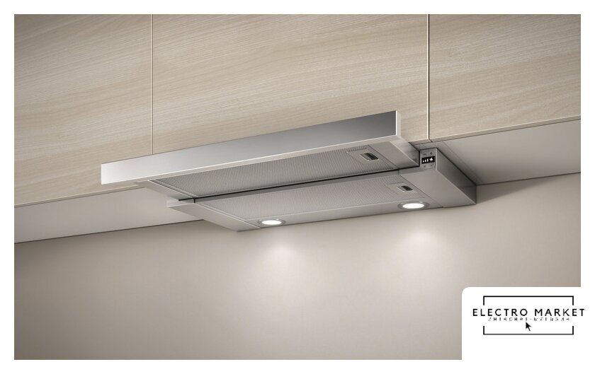 конструкция Т-образная, монтаж настенный, управление электронное/кнопочное, производительность мотора 700 м³/ч, ширина 90 см