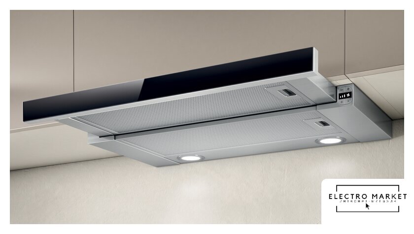конструкция скрытая, монтаж для встраивания, ширина 54 см, управление электронное/кнопочное, производительность мотора 1500 м³/ч, цвет нержавеющая сталь/черный