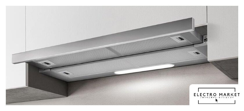 конструкция Т-образная, монтаж настенный, ширина 59.8 см, управление поворотный переключатель, производительность мотора 1200 м³/ч, цвет нержавеющая сталь
