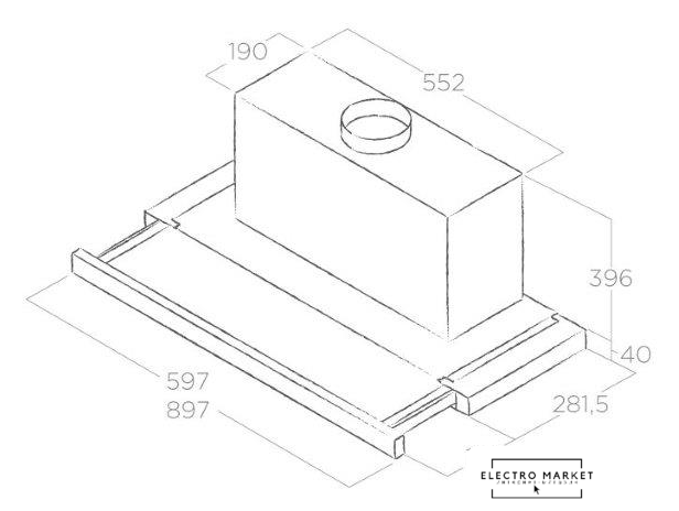 конструкция Т-образная, монтаж настенный, ширина 89.8 см, управление кнопочное, производительность вытяжки 630 м³/ч, производительность мотора 1000 м³/ч, цвет черный