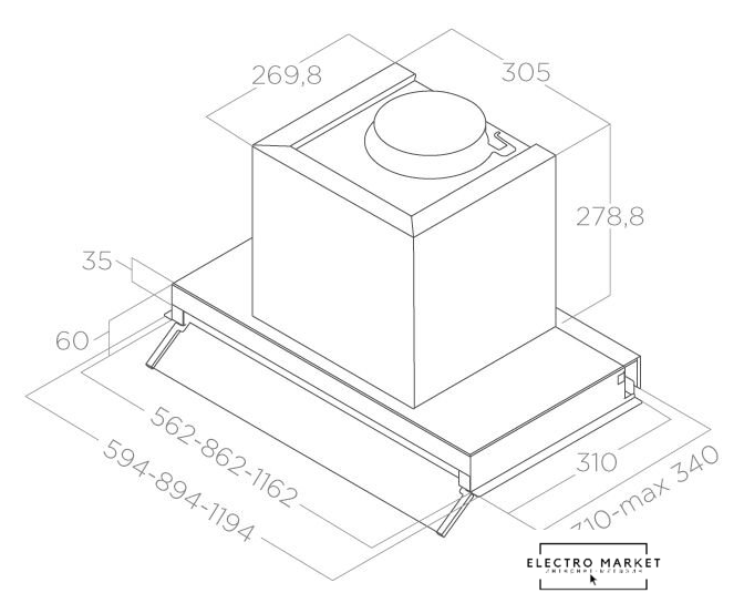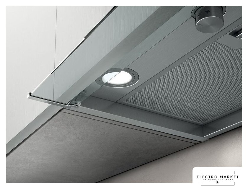 конструкция скрытая, монтаж для встраивания, ширина 54 см, управление электронное/кнопочное, производительность мотора 1500 м³/ч, цвет черный
