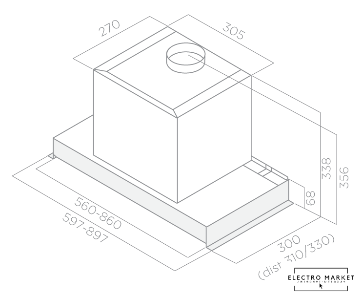 конструкция Т-образная, монтаж островной, управление электронное/кнопочное, производительность мотора 1200 м³/ч, ширина 90 см