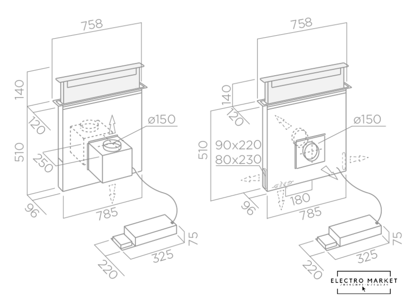 монтаж настенный/островной, управление электронное, производительность мотора 800 м³/ч, ширина 50 см