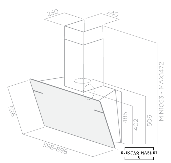 конструкция Т-образная, монтаж настенный, управление электронное/сенсорное, производительность мотора 600 м³/ч, ширина 89.8 см