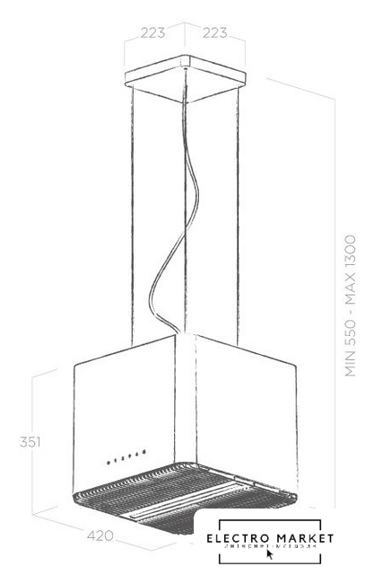 конструкция коробчатая, монтаж островной, ширина 39 см, управление электронное/кнопочное, производительность вытяжки 420 м³/ч, цвет золотой
