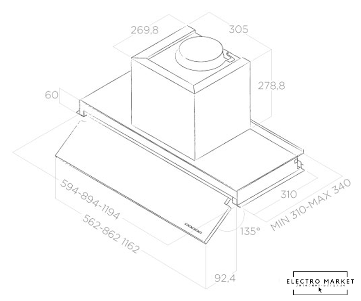 конструкция Т-образная, монтаж настенный, ширина 60 см, управление электронное/кнопочное, производительность вытяжки 451 м³/ч, цвет нержавеющая сталь