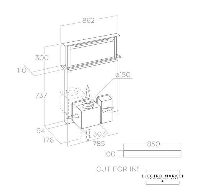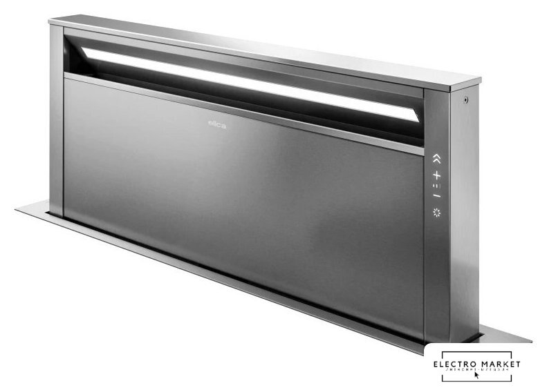 конструкция телескопическая, монтаж для встраивания в столешницу, ширина 86.2 см, управление сенсорное, производительность вытяжки 485 м³/ч, производительность мотора 1200 м³/ч, цвет серый