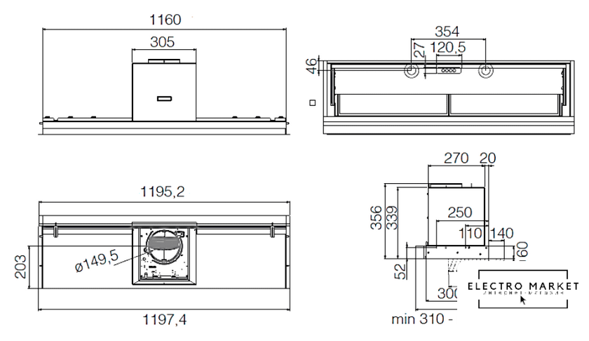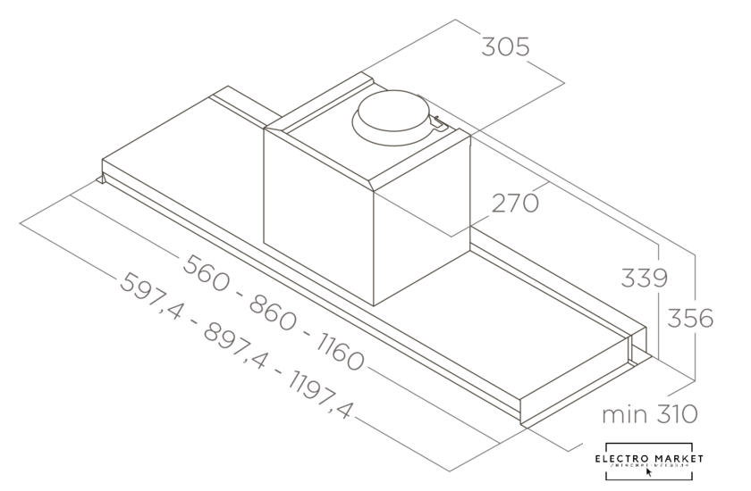 конструкция коробчатая, монтаж настенный, ширина 33.2 см, управление электронное/кнопочное, производительность вытяжки 559 м³/ч, производительность мотора 900 м³/ч, цвет белый