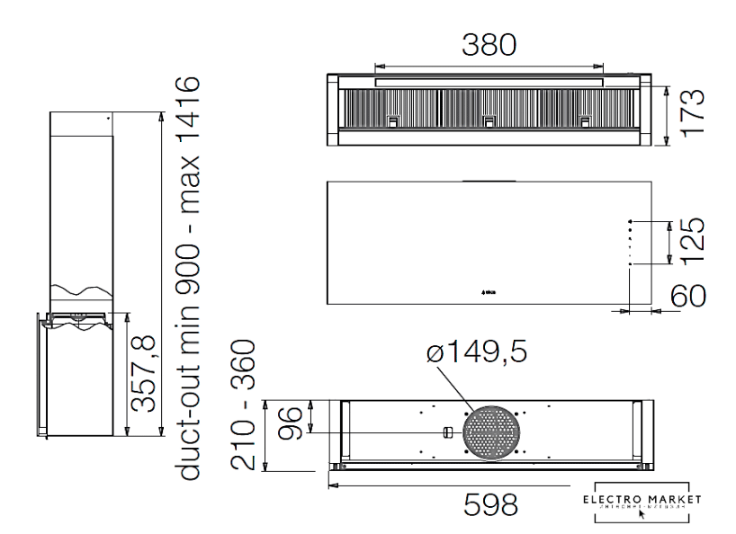 конструкция скрытая, монтаж для встраивания, ширина 119.4 см, управление электронное/кнопочное, производительность вытяжки 560 м³/ч, цвет нержавеющая сталь