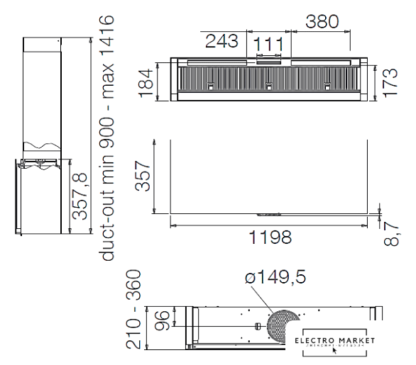 конструкция скрытая, монтаж для встраивания, ширина 119.4 см, управление электронное/кнопочное, производительность вытяжки 365 м³/ч, цвет нержавеющая сталь