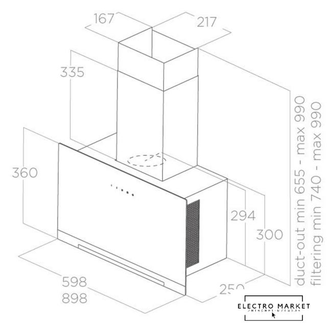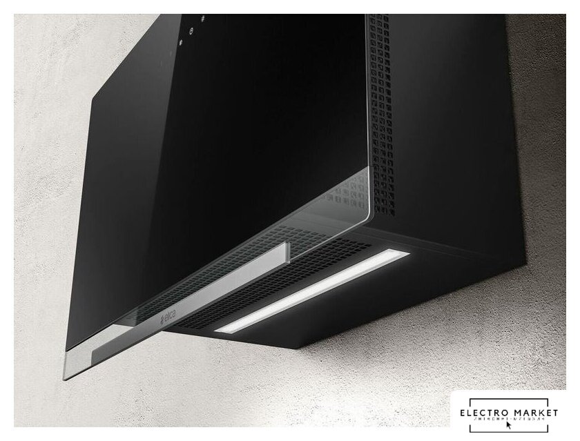 конструкция наклонная, монтаж настенный, ширина 89.8 см, управление сенсорное, производительность вытяжки 485 м³/ч, производительность мотора 704 м³/ч, цвет черный