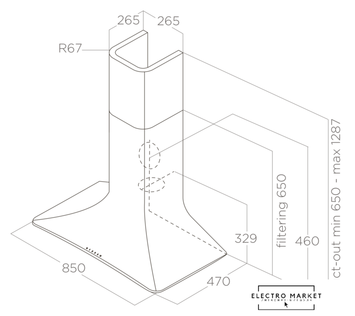 конструкция купольная, монтаж настенный, управление механическое/поворотный переключатель, производительность вытяжки 582 м³/ч, ширина 59.5 см