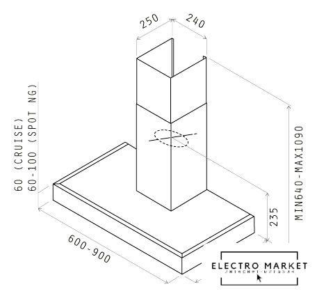 конструкция купольная, монтаж настенный, ширина 59.8 см, управление механическое/кнопочное, производительность мотора 850 м³/ч, цвет черный