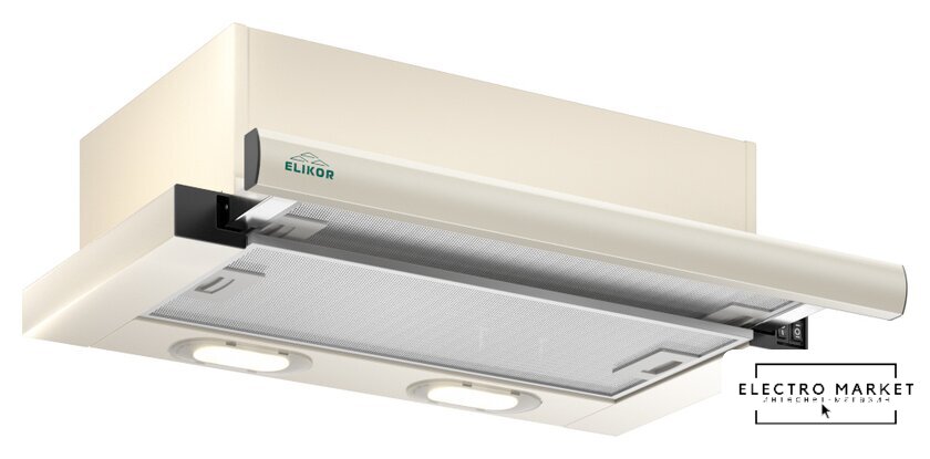 конструкция скрытая, монтаж для встраивания, ширина 52.5 см, управление механическое/кнопочное, производительность мотора 450 м³/ч, цвет белый