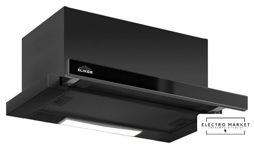 конструкция телескопическая, монтаж для встраивания, ширина 60 см, управление механическое/слайдерное, производительность вытяжки 779 м³/ч, цвет черный