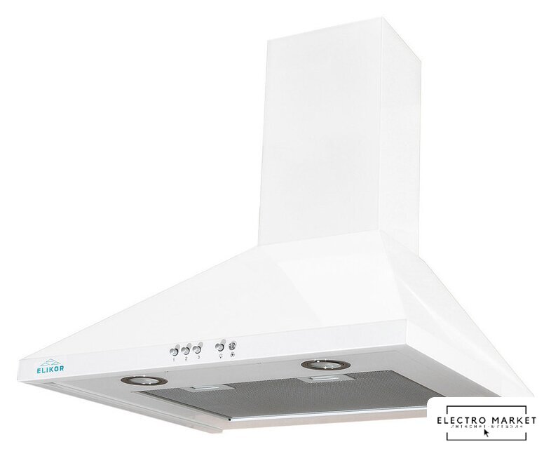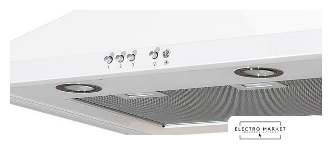 конструкция наклонная, монтаж настенный, ширина 59 см, управление механическое/кнопочное, производительность мотора 430 м³/ч, цвет белый
