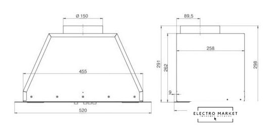 конструкция скрытая, монтаж для встраивания, ширина 52 см, управление слайдерное, производительность мотора 400 м³/ч, цвет нержавеющая сталь