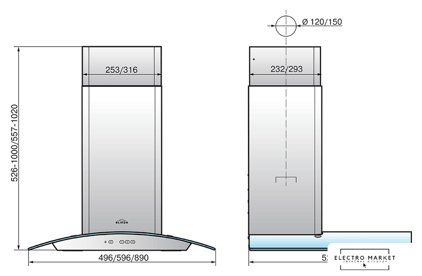 конструкция Т-образная, монтаж настенный, управление механическое/кнопочное, производительность мотора 430 м³/ч, ширина 60 см