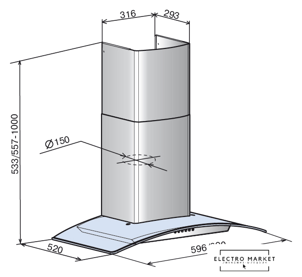 конструкция Т-образная, монтаж настенный, ширина 60 см, управление электронное, производительность мотора 1030 м³/ч, цвет нержавеющая сталь