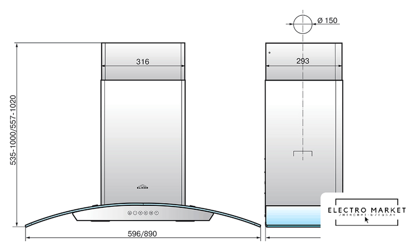 конструкция Т-образная, монтаж настенный, ширина 59 см, управление сенсорное, производительность мотора 1000 м³/ч, цвет нержавеющая сталь/белый