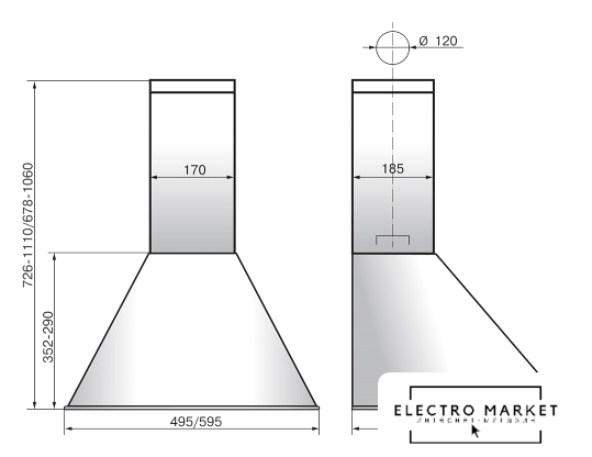 конструкция наклонная, монтаж настенный, управление механическое/кнопочное, производительность мотора 800 м³/ч, ширина 60 см
