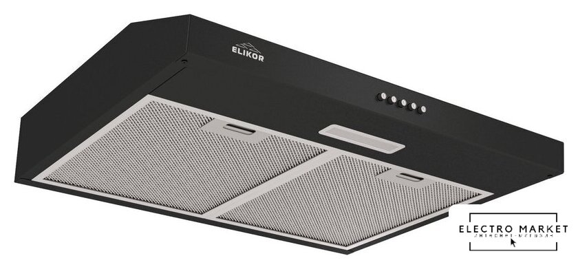 конструкция плоская, монтаж настенный, ширина 49.5 см, управление механическое/кнопочное, производительность мотора 400 м³/ч, цвет черный