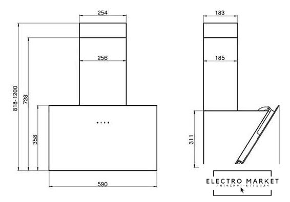 конструкция наклонная, монтаж настенный, ширина 59.8 см, управление механическое/кнопочное, производительность мотора 400 м³/ч, цвет нержавеющая сталь/черный