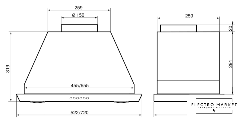 конструкция купольная, монтаж настенный, управление электронное/кнопочное, производительность мотора 600 м³/ч, ширина 60 см