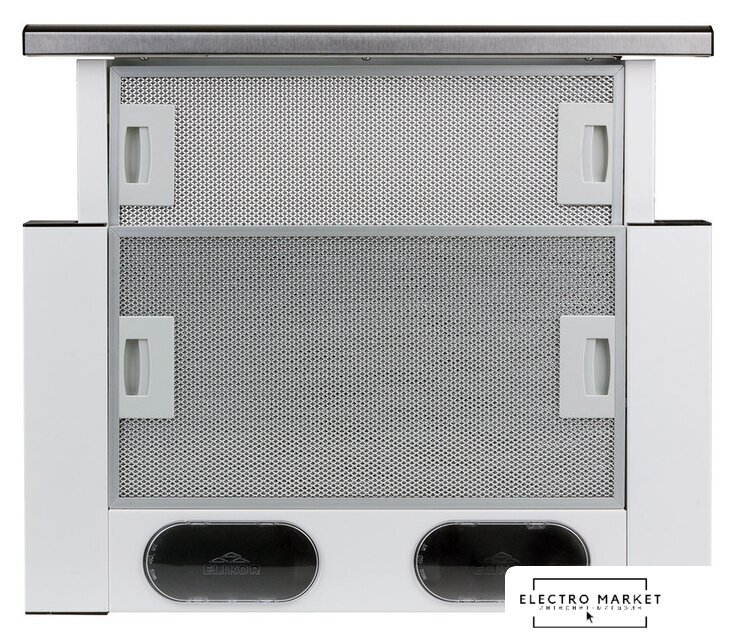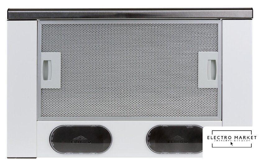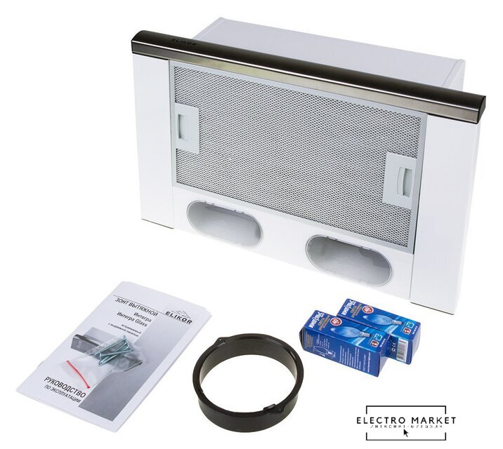 конструкция скрытая, монтаж для встраивания, ширина 52.5 см, управление механическое/кнопочное, производительность мотора 450 м³/ч, цвет белый
