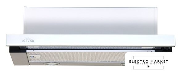 конструкция телескопическая, монтаж для встраивания, ширина 60 см, управление механическое/кнопочное, производительность мотора 400 м³/ч, цвет белый/нержавеющая сталь