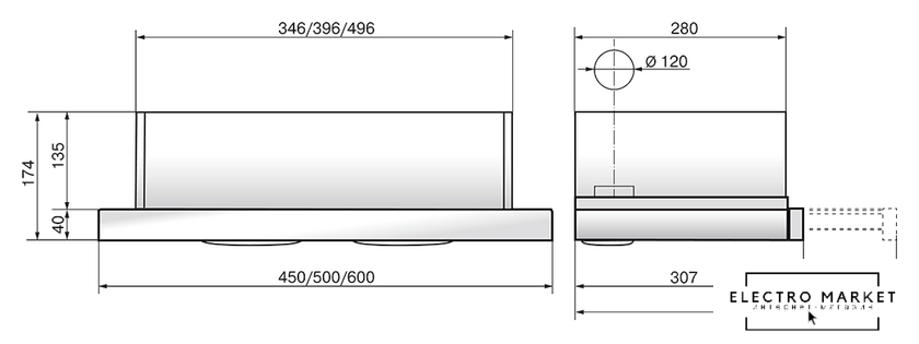 конструкция телескопическая, монтаж для встраивания, ширина 60 см, управление механическое/кнопочное, производительность мотора 400 м³/ч, цвет нержавеющая сталь/черный