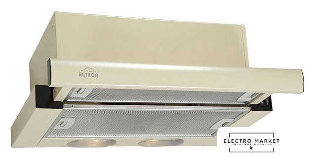 конструкция телескопическая, монтаж для встраивания, управление механическое/кнопочное, производительность мотора 400 м³/ч, ширина 60 см