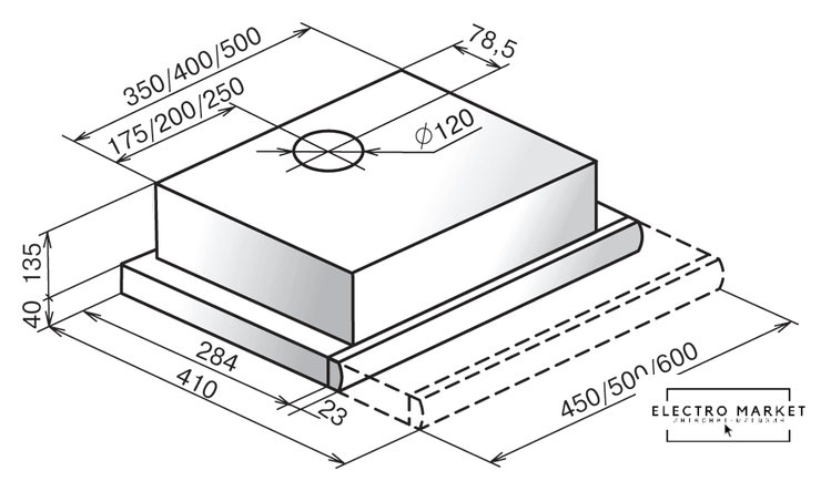 конструкция телескопическая, монтаж для встраивания, управление механическое/кнопочное, производительность мотора 400 м³/ч, ширина 45 см