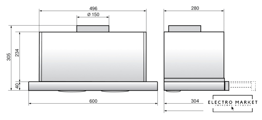 конструкция телескопическая, монтаж для встраивания, управление механическое/слайдерное, производительность мотора 600 м³/ч, ширина 30 см