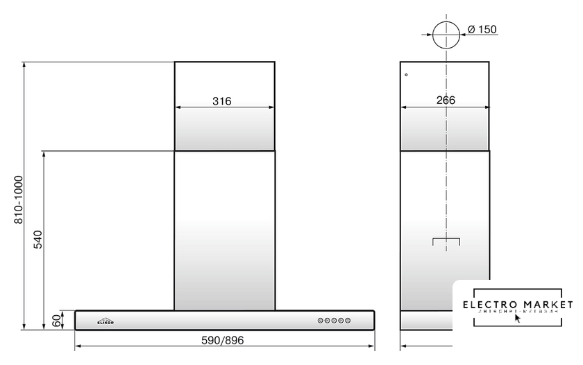 конструкция наклонная, монтаж настенный, ширина 59.5 см, управление механическое/кнопочное, производительность мотора 600 м³/ч, цвет черный