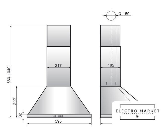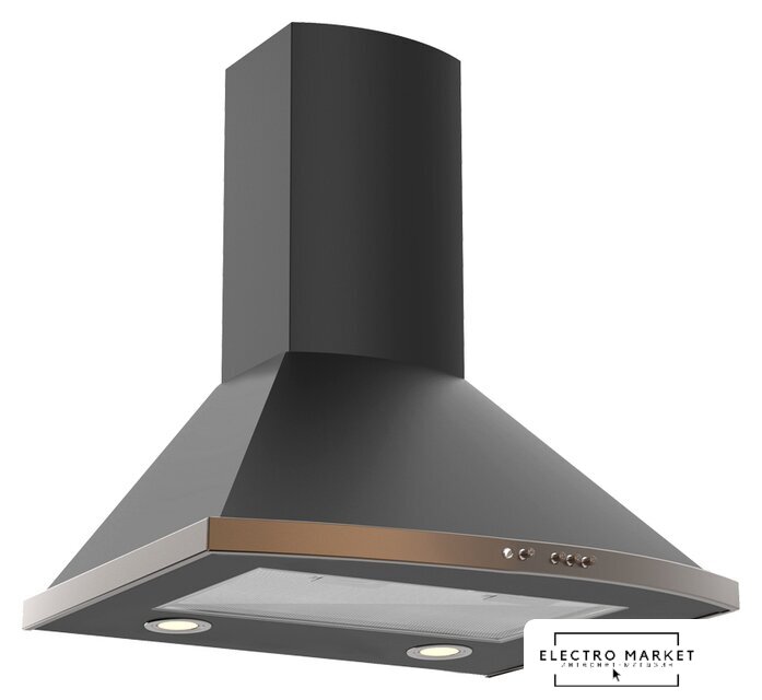 конструкция наклонная, монтаж настенный, ширина 59.5 см, управление механическое/кнопочное, производительность мотора 650 м³/ч, цвет черный