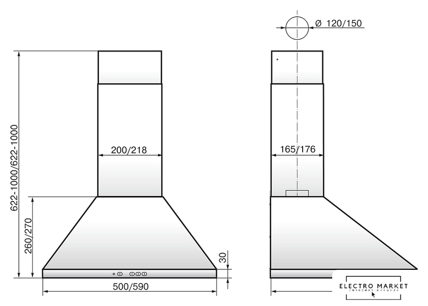 конструкция Т-образная, монтаж настенный, ширина 60 см, управление механическое/кнопочное, производительность мотора 750 м³/ч, цвет серебристый