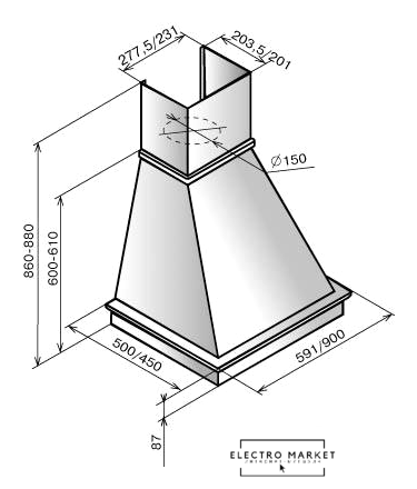 конструкция купольная, монтаж настенный, управление электронное/кнопочное, производительность мотора 600 м³/ч, ширина 60 см