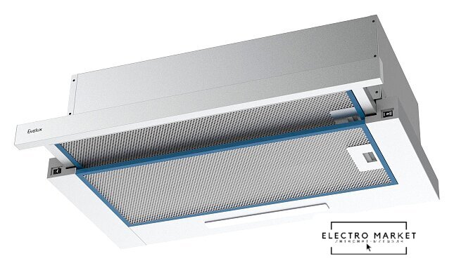 конструкция телескопическая, монтаж для встраивания, ширина 60 см, управление механическое/кнопочное, производительность вытяжки 177 м³/ч, производительность мотора 520 м³/ч, цвет белый