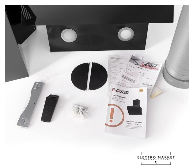 Комплектация | Пластиковая гофра (2м), планка для навешивания вытяжки, кронштейн для навешивания короба-удлинителя, обратный клапан, короб удлинитель 2 шт, саморезы-дюбеля. |