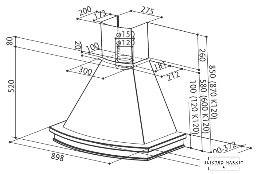 конструкция коробчатая, монтаж настенный, ширина 31 см, управление электронное/кнопочное, производительность мотора 900 м³/ч, цвет нержавеющая сталь