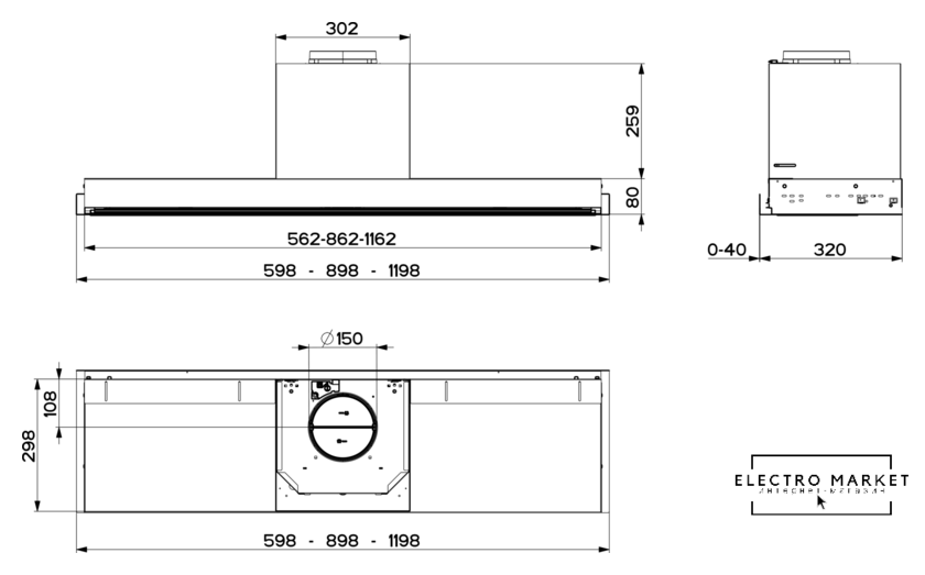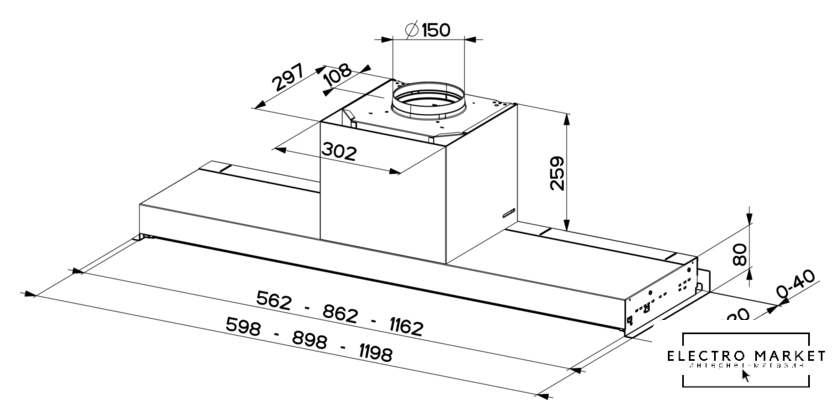 конструкция коробчатая, монтаж настенный, ширина 40.2 см, управление электронное/кнопочное, производительность мотора 1150 м³/ч, цвет нержавеющая сталь