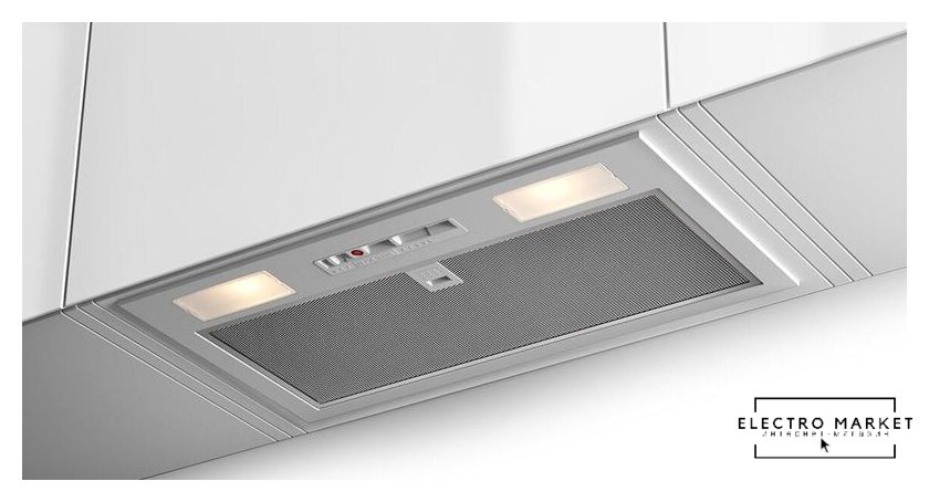 конструкция скрытая, монтаж для встраивания, ширина 59.8 см, управление механическое/кнопочное, производительность мотора 1150 м³/ч, цвет белый