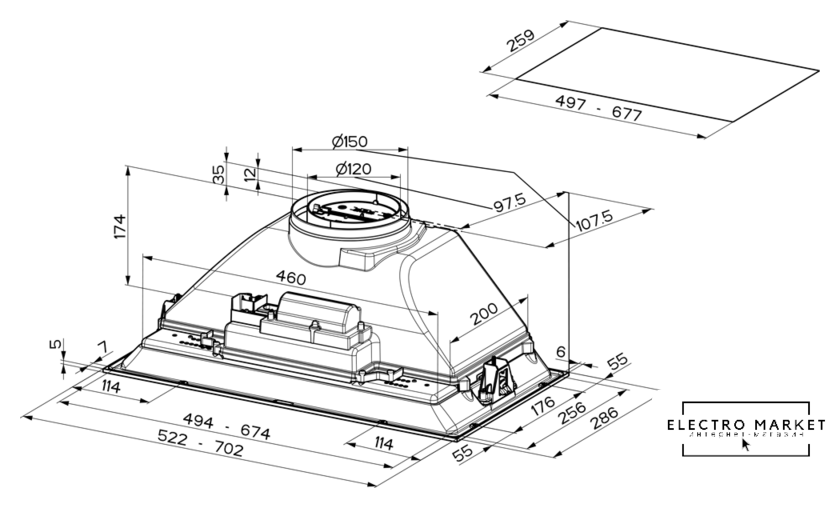 конструкция скрытая, монтаж для встраивания, ширина 69.8 см, управление сенсорное, производительность мотора 1050 м³/ч, цвет черный