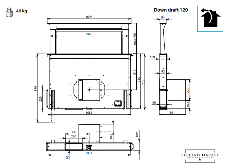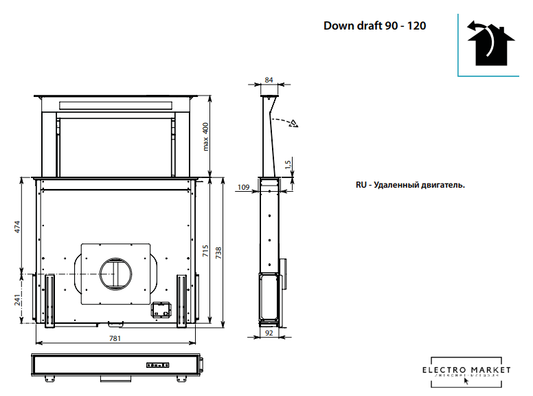 конструкция телескопическая, монтаж для встраивания в столешницу, ширина 83.5 см, управление электронное/кнопочное, производительность вытяжки 515 м³/ч, производительность мотора 1200 м³/ч, цвет черный