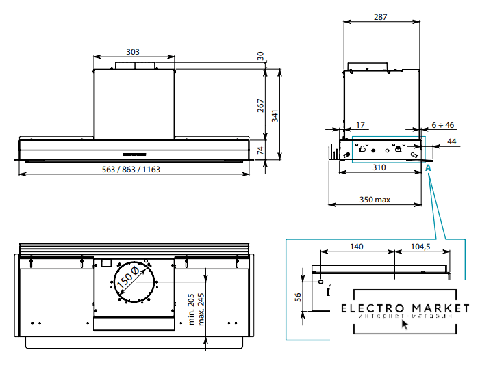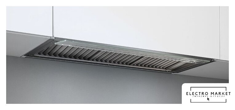 конструкция Т-образная, монтаж настенный, ширина 89.8 см, управление электронное/кнопочное, производительность вытяжки 520 м³/ч, производительность мотора 800 м³/ч, цвет нержавеющая сталь