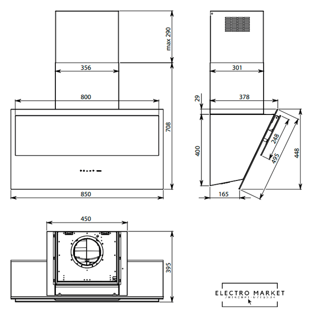 конструкция наклонная, монтаж настенный, управление электронное/кнопочное, производительность вытяжки 649 м³/ч, ширина 75 см