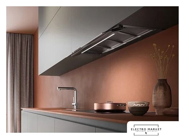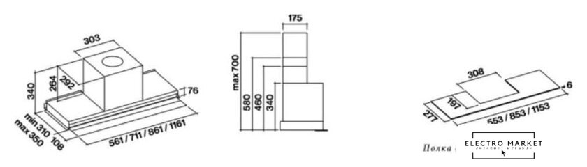 конструкция Т-образная, монтаж настенный, ширина 89.8 см, управление поворотный переключатель, производительность вытяжки 620 м³/ч, производительность мотора 900 м³/ч, цвет черный