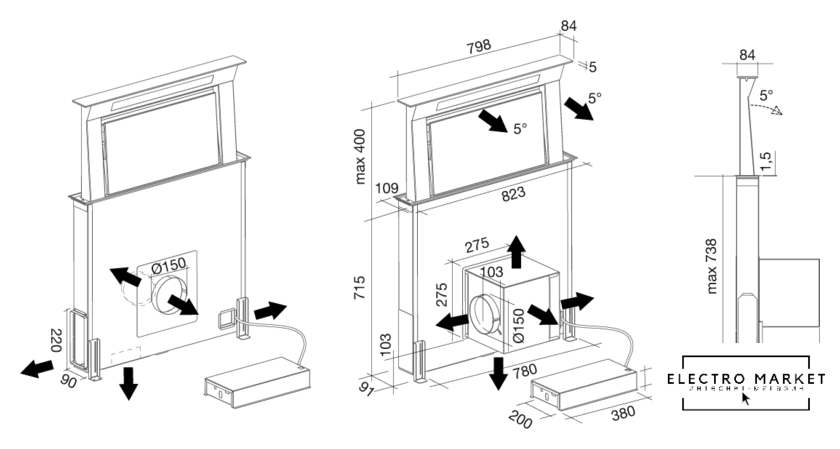 монтаж для встраивания, управление сенсорное, производительность мотора 800 м³/ч, ширина 79.8 см